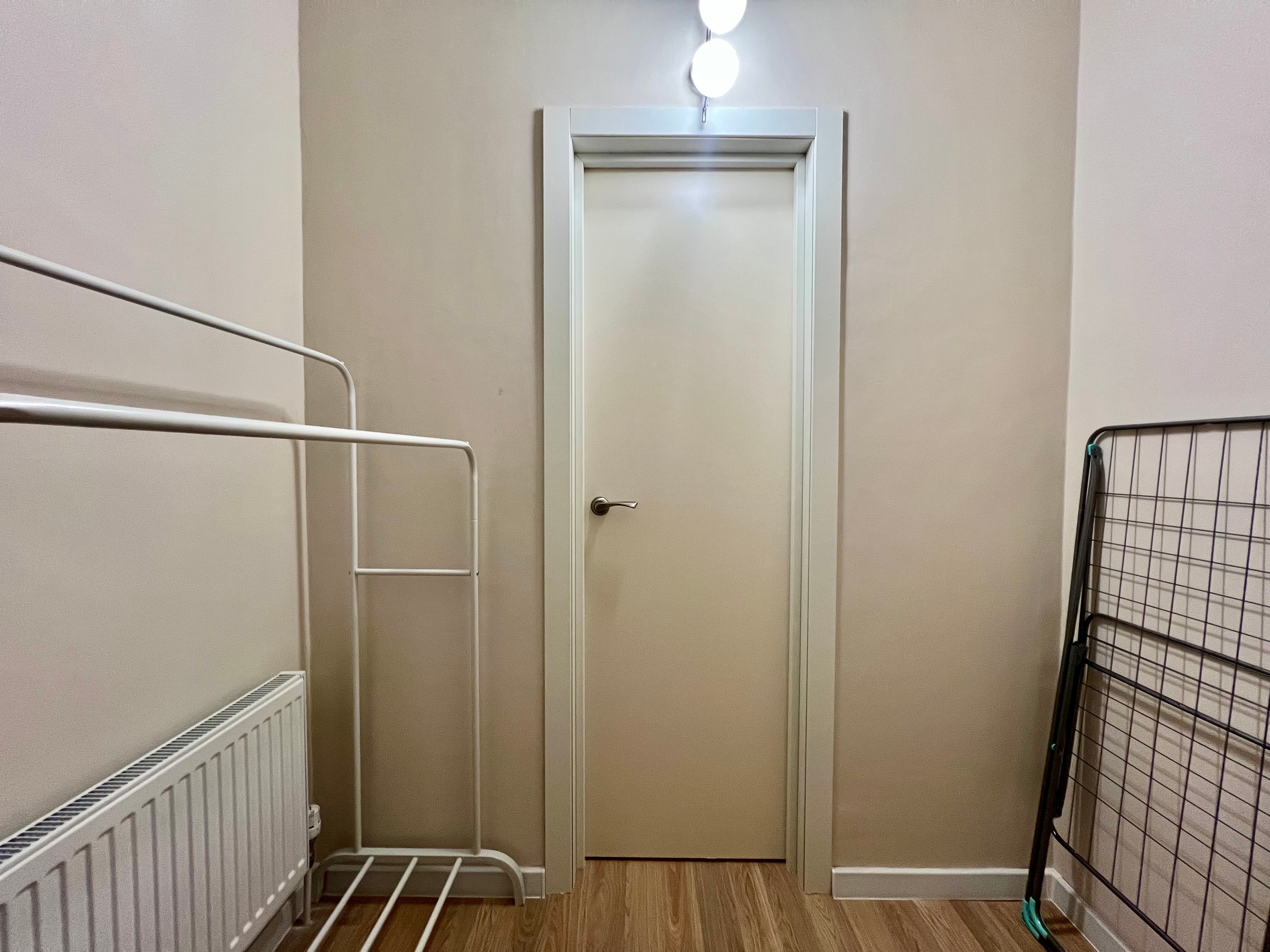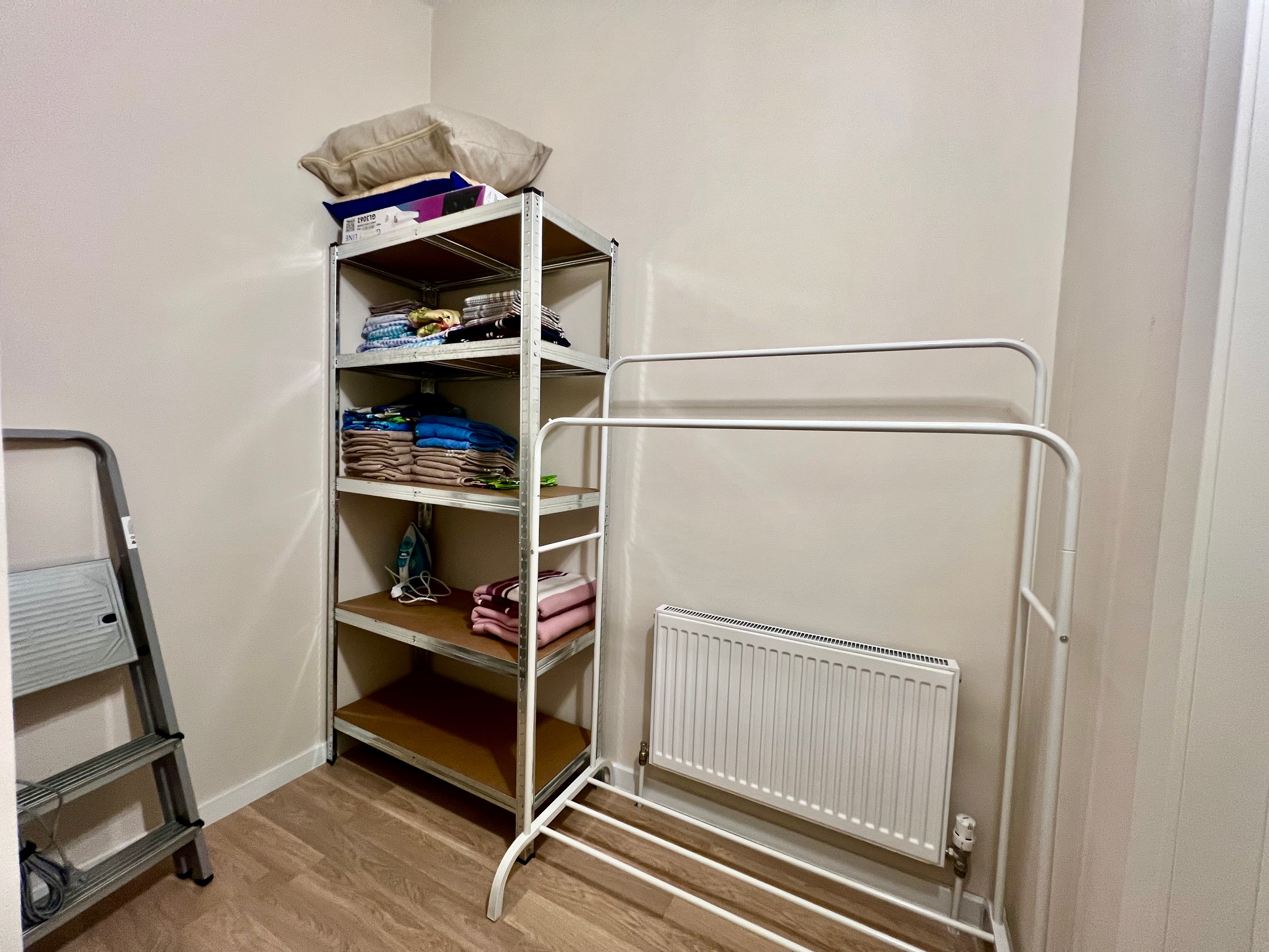 Обеденный стол, стулья, шкаф для одежды, гардеробная, гладильная доска.