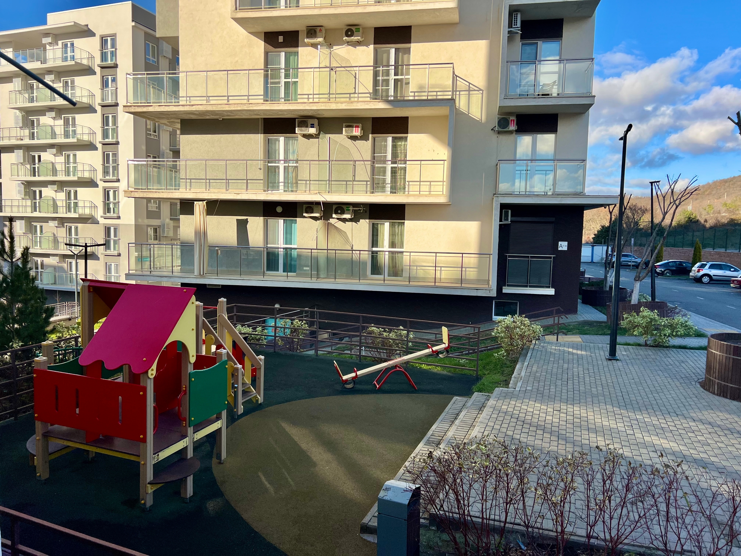 Французский балкон с видом во двор. Москитная сетка на окнах. До моря 7 минут пешком.
